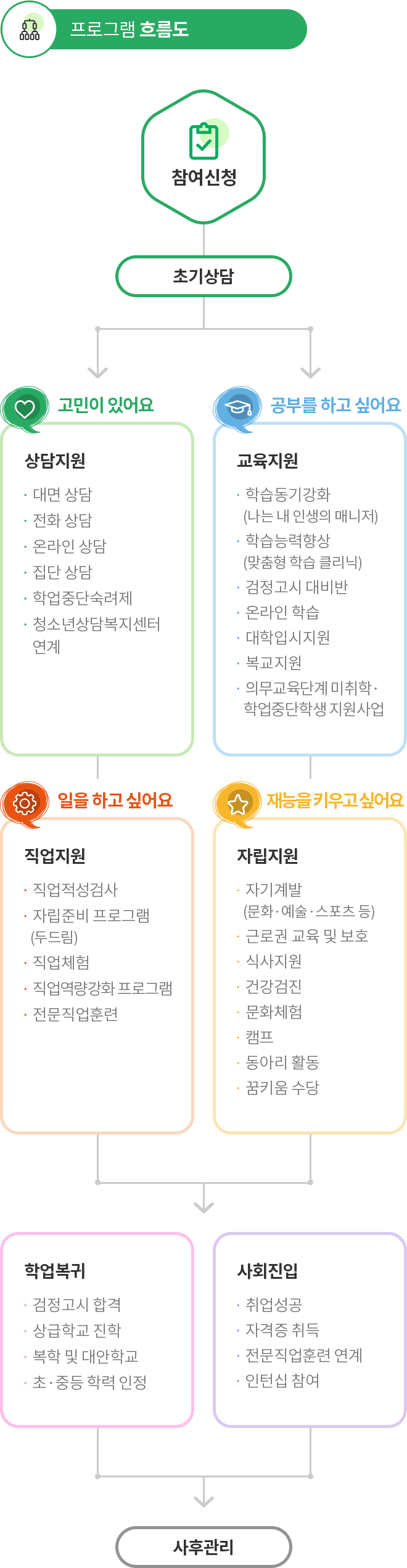 학교라는 울타리를 벗어나 학업을 중단한 청소년들의 학업 복귀와 사회진입을 지원하고 학교 밖 청소년들의 다양한 적성과 욕구를 고려한 맞춤형 서비스를 제공합니다.